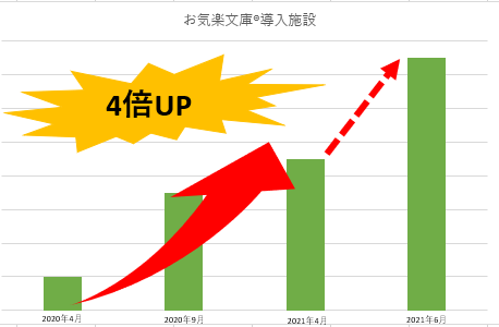 【お気楽文庫(R)】は、昨年(2020年3月)にサービス開始し、1年で導入施設数は4倍(昨年4月比)に増加しました。(図1)