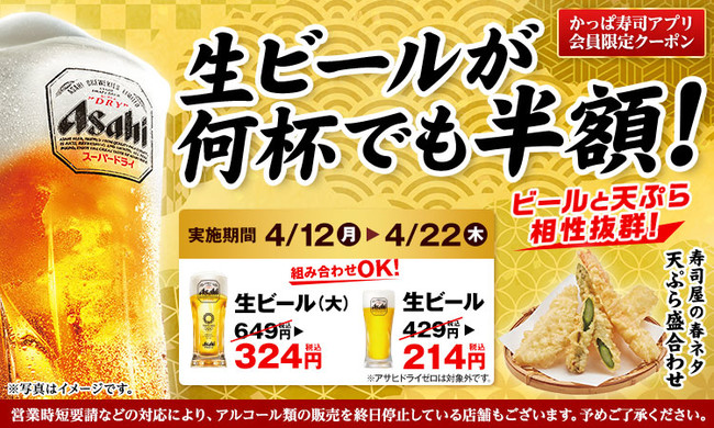 コロワイドグループのかっぱ寿司(カッパ・クリエイト(株) 本社:神奈川県横浜市 代表取締役社長 田邊公己)は、2021年4月12日(月)~4月22日(木)の期間中、かっぱ寿司で使用できる「生ビール半額クーポン」「ドリンクバー半額クーポン」をかっぱ寿司公式アプリ会員に配信いたします。