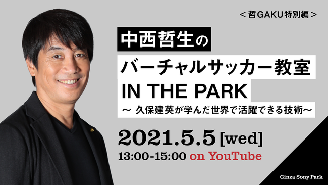 Ginza Sony Park (銀座ソニーパーク)は、スポーツジャーナリストでパーソナルコーチの中西哲生がMCを務める連続講座『哲GAKU』の特別編として、サッカーを楽しむ親子に向けて「中西メソッド」を伝授する「中西哲生のバーチャルサッカー教室 IN THE PARK」を2021年5月5日(水・祝)に開催、Ginza Sony Park公式のYouTubeチャンネルでライブ配信します。視聴者からの個別相談に応えるコーナーもあり、限定5組の親子には当日にGinza Sony Parkで中西哲生のパーソナルクリニックを直接ご体験いただきます。
