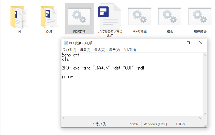 「2PDF」は、Windowsのコマンドプロンプトを活用します。バッチファイルと呼ばれるファイルを実行するだけで、誰でも簡単に、驚異のスピードで、PDF変換・結合・分割ができます。バッチファイルはメモ帳で作成可能です。