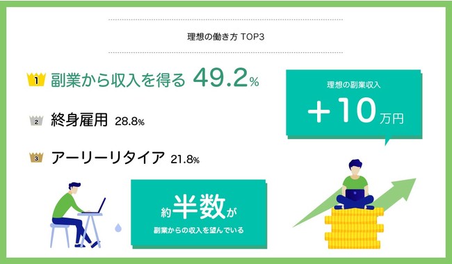また、理想的な働き方を尋ねたところ、約半数が「副業からも収入を得る(49.2%)」を挙げ、本業以外に収入を得たいと考えている人が多いことがわかり、2位「終身雇用(安定して長く働くこと)(28.8%)」、3位「アーリーリタイア(不労所得のある早期退職)(21.8%)」という結果となりました。