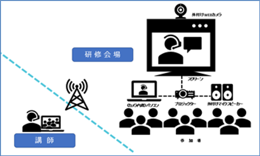 講師は現地施設に赴かず、「講師会場」と「研修会場(各施設)」をオンラインでつなぎ、受講者は、スクリーンや画面越しに講師と対話しながら研修を受講頂きます。PC1台・ネット環境(ポケットWi-Fiも可)等の基本的なシステム機器があれば実施できます。