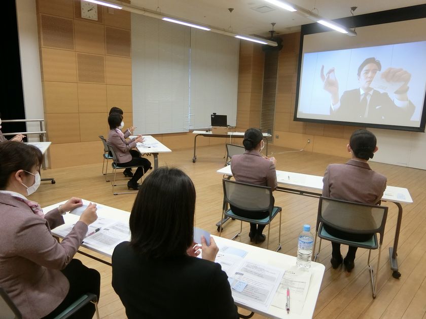 研修の主な内容は、鑑賞者アンケート調査(※)結果に基づく「コロナ前後のサービス変化」の講義と、「具体的なサービススキル」の実技指導と「施設で働くスタッフの安全対策」。お客様側だけではなく、スタッフ側の、業務における感染への心的ストレス解消も目的としています。