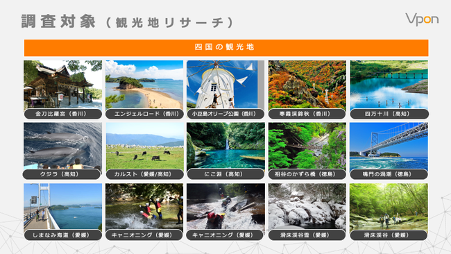 対象者に以下の12観光地15種類の写真提示を行い、「各観光地への興味」と行ってみたいかどうかの「旅行意欲」を調査。調査対象観光地は、徳島・香川・愛媛・高知の4県からアクティビティ軸としてハード/ソフト、自然景色軸として海&島/森林/文化の要素が含まれる12観光地(アクティビティ)をピックアップ。