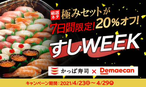 コロワイドグループのかっぱ寿司(カッパ・クリエイト(株) 本社:神奈川県横浜市 代表取締役社長 田邊公己)は、出前サービス「出前館」(運営:株式会社出前館)が開催する「すしweek」キャンペーン【開催期間2021年4月23日(金)~4月29日(木)】に参加いたします。