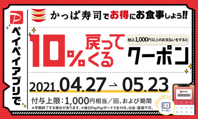 本クーポンは、期間中かっぱ寿司店内飲食またはお持ち帰り商品1,000円(税込)以上のお支払い時にPayPay残高でお支払いいただくと、10%のPayPayボーナス(付与上限1,000円相当/回および期間)が付与される大変お得なキャンペーンとなっております。