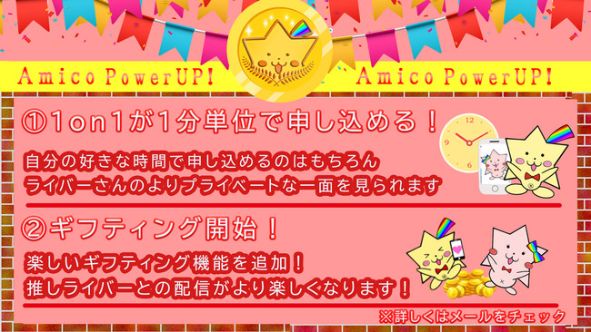 株式会社AULink(本社:大阪市西区、代表取締役社長:山根伸一、以下「当社」)は、ライブ配信サービス「AmicoLive」において、投げ銭機能や定型コメント機能などを実装する大型アップデートを実施致しました。リスナーがライバーを独占できる「1on1」サービスも、より気軽に楽しんで頂くために1分単位で申し込み可能になりました。