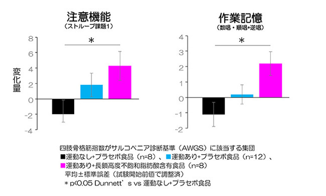 サルコペニアの傾向がある集団において、「運動あり+長鎖高度不飽和脂肪酸含有食品」のグループの注意機能と作業記憶が「運動なし+プラセボ食品」のグループと比べて改善しました(図1)。一方、「運動あり+プラセボ食品」のグループでは改善が認められませんでした。