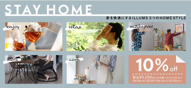 北欧家具・雑貨を取り扱うライフスタイル専門店『ILLUMS(イルムス)』(株式会社イルムスジャパン 本社:東京都渋谷区 代表者:高際兼一)は、2021年6月1日 12:00 まで、ILLUMS online shopにて「STAY HOME 家を快適にする ILLUMS 5つの HOME STYLE」キャンペーンを開催いたします。「Enjoy at home(家で楽しむ)」「Work at home(家で頑張る)」など、5つのオケージョンにおすすめのアイテムを紹介。期間中に税込5,000円以上のお買い上げのお客様全員に、10%OFFクーポンをプレゼントいたします。