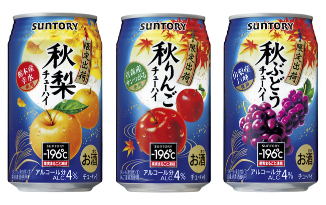 サントリースピリッツ(株)は、「-196℃〈秋梨〉」「-196℃〈秋りんご〉」「-196℃〈秋ぶどう〉」を8月17日(火)から全国で秋季限定新発売します。