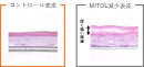 そこでまず、肌の透明感やうるおいに重要な表皮形成に及ぼすMITOLの影響を検討しました。その結果、老化した細胞ではMITOL量が明らかに減少していることがわかりました(図1)。また、MITOLを減少させる処置を施した肌細胞から表皮構造を形成させると、老化した肌でも認められるような厚く粗い構造となっていることが確認されました(図2)。これらのことから、老化によってMITOLが減少し、表皮形成異常が生じている可能性が示唆されました。
