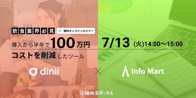 株式会社補助金ポータル(本社:東京都渋谷区、代表取締役:福井彰次)は、飲食業界が抱える様々な課題を解決するためのセミナー「飲食業界必見!? 導入から半年で100万円のコストを削減したツール」を7月13日(火)、14時から開催。