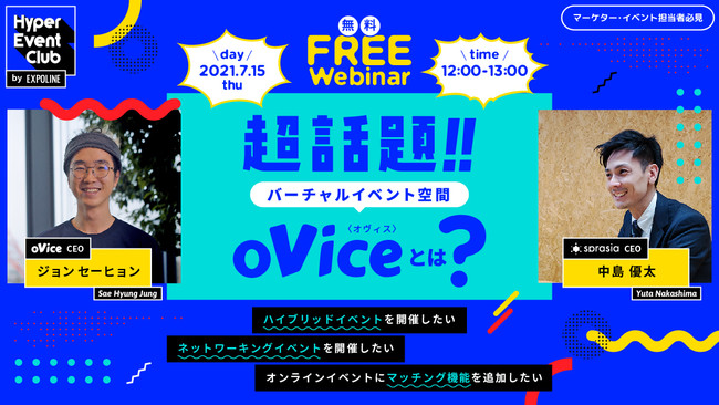 オンラインとは思えない、リアルなコミュニケーションができるバーチャル空間「oVice(オヴィス)」を提供するoVice株式会社(本社:石川県七尾市、代表取締役:ジョン・セーヒョン)は、7月15日開催の株式会社スプラシア(本社:東京都中央区、代表取締役:中島優太)社主催の無料ウェブセミナーに登壇します。バーチャル空間を使ったイベント開催のコツやこれまでの事例について解説します。