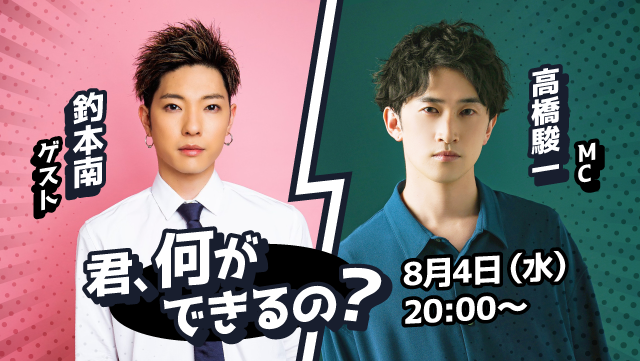 俳優「高橋駿一」の新番組「きみ、何ができるの?」が、8月4日(水)20:00からmahocastにて配信されることが決定した。