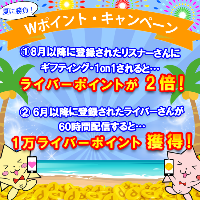 内容 :2021年8月1日以降に登録されたリスナーさんから、1on1Live・ギフトを貰った際の獲得ライバーポイントが2倍となります。