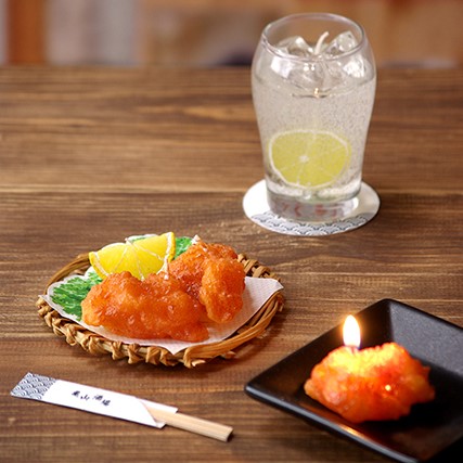 居酒屋で食べたからあげを再現すべく、ざるや敷紙などローソク以外の部分にもこだわりました。