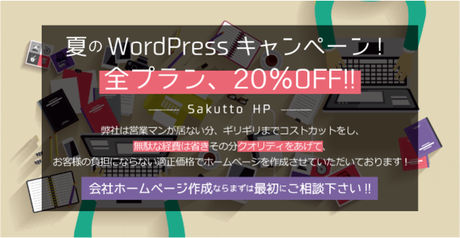 さくっとホームページ作成はWordPressに特化したホームページ制作サービスにて「夏のWordPressキャンペーン! 全プラン20%OFF!!」を実施いたします。