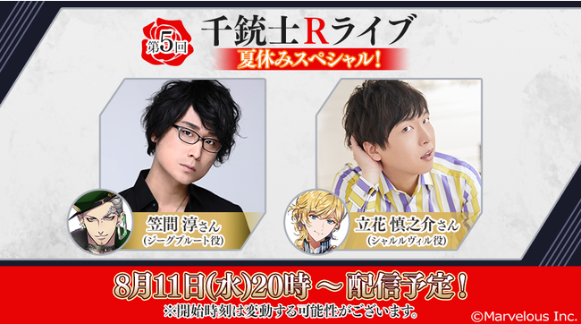 株式会社マーベラス(代表取締役社長 許田周一/所在地:東京都品川区)は、『千銃士』プロジェクトの完全新作スマートフォンゲーム『千銃士:Rhodoknight』(読み:せんじゅうし ろーどないと 以降、『千銃士R』)において、笠間淳さん、立花慎之介さんによる第5回『千銃士Rライブ』を8月11日(水)20時から配信することを決定いたしました。番組ではこれまで公開済みの情報のおさらいや、新情報など盛りだくさんでお届けいたします。