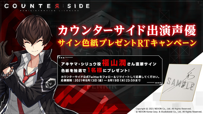 オンラインゲーム配信事業を行う株式会社ネクソン(本社:東京都港区、代表取締役社長:Owen Mahoney/オーウェン・マホニー、東証:3659、以下 ネクソン)は、2021年冬に配信予定のスマートフォンおよびPC向けの新作タイトル『COUNTER: SIDE』(カウンターサイド)の公式Twitter(@COUNTERSIDE_NXJ)において、コフィンカンパニー「フェンリル小隊」のキャラクター、アキヤマ・シリュウ役を演じる声優 福山潤さんの直筆サイン色紙が当たるTwitterキャンペーンを本日より開始いたしました。