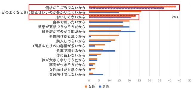 一方、関心がありながらも、プロテインパウダーを利用してない方では、図2のとおり最も多かったのは「価格が手ごろでないから」、その他に「おいしくないから」が一定数いることがわかりました。