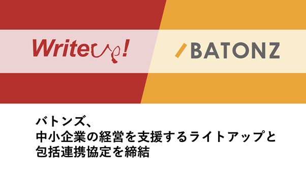 株式会社ライトアップ(本社:東京都渋谷区、代表取締役社長:白石崇 、以下ライトアップ)は、M&A総合支援プラットフォーム「BATONZ(バトンズ)」を運営する株式会社バトンズ(本社:東京都千代田区、代表取締役社長 兼 CEO:大山敬義、以下バトンズ)と、中小企業の支援体制を強化し、中小M&A市場の拡大に向けて包括連携協定に合意しました。