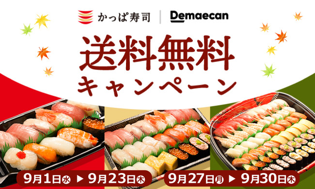 コロワイドグループのかっぱ寿司(カッパ・クリエイト(株) 本社:神奈川県横浜市)は、出前サービス「出前館」(運営:株式会社出前館)にて2021年9月1日(水)~9月23日(木)及び9月27日(月)~9月30日(木)の期間、出前館「送料無料キャンペーン」を開催いたします。