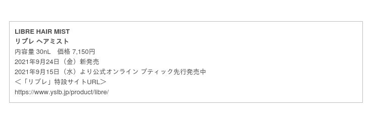 幕開けはフレッシュにはじけて透明感に包まれるフルーティフローラル。ハートノートは、マスキュリンなラベンダーと、フェミニンなオレンジブロッサムの衝突で生み出される「リブレ」のアイコニックな香り。ラストノートにバニラやシダーウッドの甘く穏やかな余韻が訪れます。