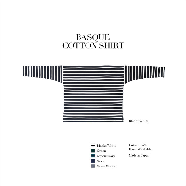 耐久性のある素材、どんな状況下でも着替えられるという本来のバスクシャツが持っているデザインのポイントを、前後関係なく着用できる直線的な襟や平面的なシルエットにリデザインし完成しました。