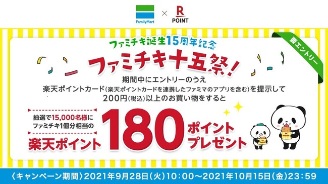 ・概要:期間内に「楽天ポイントカード」のキャンペーンページでエントリーのうえ、対象のファミリーマートの店舗にて200円(税込)以上を購入し、会計時に「楽天ポイントカード」もしくは「楽天ポイントカードアプリ」を提示いただいた方の中から抽選で15,000名に「ファミチキ」1個分相当の「楽天ポイント」180ポイントを進呈。