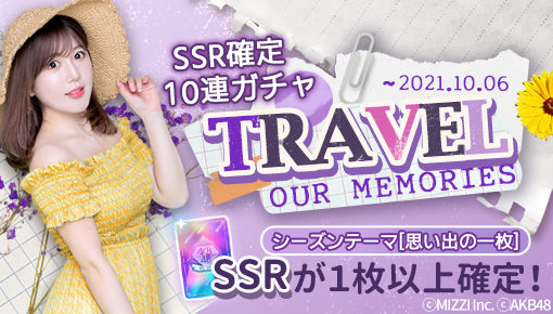 * SSR確定ガチャ:10連ガチャでSSRカード1枚以上確定となります。(※全SSRカードのうち「思い出の一枚」テーマカードの排出確率がアップ)