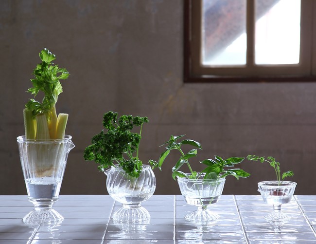 ~話題の再生野菜“リボベジ“でサスティナブルな暮らしを送ろう~ 気軽に始められるプチ菜園!捨てる野菜がおしゃれなグリーンインテリアに様変わり!「リボベジガラス」 全4型発売