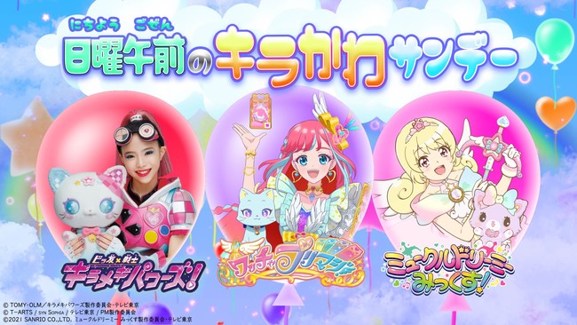 テレビ東京では2021年10月24日(日)と10月31日(日)に、秋のコラボ企画「日曜午前のキラかわサンデー」キャンペーンを実施します。本キャンペーンでは、キラキラでかわいい人気3番組「ビッ友×戦士 キラメキパワーズ!」「ワッチャプリマジ!」「ミュークルドリーミー みっくす!」がコラボレーションし、合同で視聴者プレゼントを行います。