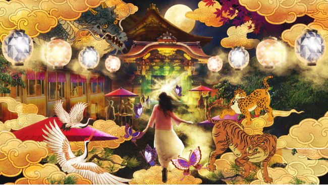 クリエイティブAIがプロジェクションを生み出す巨大インタラクティブ・ランドアートや、新型コロナウイルス感染症の終息を願う光のアートなどの演出テーマは“原点回帰”。会場内を満たす光と音が、重要文化財の唐門や特別名勝の二の丸庭園など、二条城が持つ情景や造形美の魅力を引き立たせ、来場者に二条城の持つ本質的な価値の再発見を促します。さらに京都の名店が集う食のコーナーも登場。伝統と革新を融和させ日本文化を再発見するワントゥーテンの「夜会」が、満を持して京都に初上陸いたします。