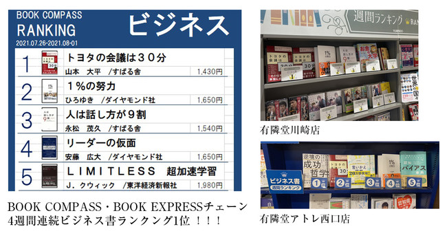 BOOK COMPASS・BOOK EXPRESSチェーンにて7/5~8/1の4週間連続でビジネス書ランキング1位を獲得するなど、引き続き多くの書店にてビジネス書ランキング上位にランクインし、読者の皆様にも支持されています。今後とも、さらに本書籍を多くの方々に届けていきます!
