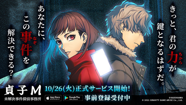 グラビティゲームアライズ株式会社(所在地:東京都中央区)は、現在事前登録期間中のスマートフォン・タブレット向け謎解きホラー脱出アドベンチャー「貞子M 未解決事件探偵事務所」において、2021年10月26日(火)より正式サービスを開始いたします。