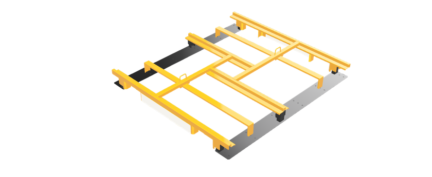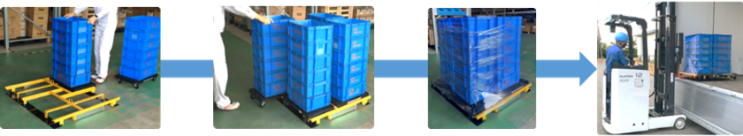 ・4つの平台車をひとまとめに積載しフォークリフト移動・トラック運搬ができる。
