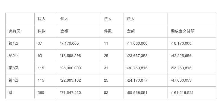 また、これまでに 4 回の助成を実施し、累計で個人 360 名、法人 92 社にたいして助成金を交付しました。