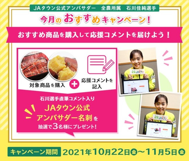JAタウンでは、10月22日から「石川佳純選手 今月のおすすめキャンペーン」を開始します。このキャンペーンは、これらの選定した商品をお買い上げいただき、注文コメントに石川選手への応援メッセージを書いていただいた方の中から、抽選で2名様に石川選手直筆のコメント入り「JAタウン公式アンバサダー名刺」、1名様に石川選手直筆のコメント入り「JAタウン公式アンバサダー名刺」と今月のおすすめ商品のセットをプレセントします。ぜひ、この機会にキャンペーンにご参加ください。