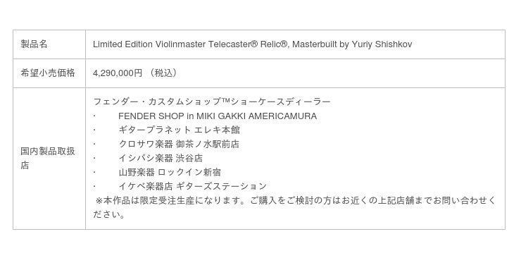 フェンダー ミュージカル インストゥルメンツ コーポレーション(所在地:米国 カリフォルニア、CEO アンディ・ムーニー)は、フェンダー・カスタムショップ(TM)より、マスタービルダーのユーリ・シスコフによる最新作品『Limited Edition Violinmaster Telecaster(R) Relic(R)』を発表しました。本作品は、世界60本限定の受注生産となり、日本でも4本限定※で発売されることが決定しました。購入をご検討の方は、全国のフェンダー・カスタムショップ(TM)ショーケースディーラーまでお問い合わせください。(※国内での販売本数は変動する可能性があります。)