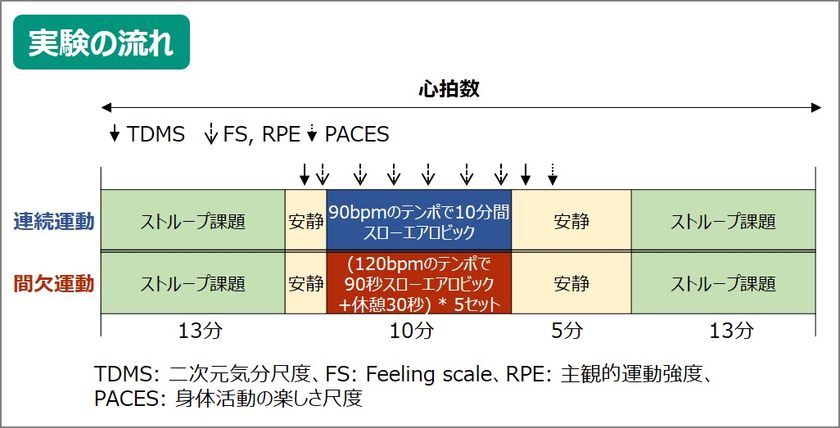 トータルの反復回数を揃え、運動強度の指標として、運動中の心拍数から心拍予備率を算出し、さらに自覚的運動強度(RPE)を測定しました。認知機能の評価としてストループ課題を運動の前後に行いました。気分の測定として、運動前後に二次元気分尺度(TDMS)という質問紙によって快適度と覚醒度を評価し、運動中の気分変化をFeeling scaleで評価しました。さらに、運動後に身体活動の楽しさ尺度(PACES)によって運動の楽しさを評価しました。