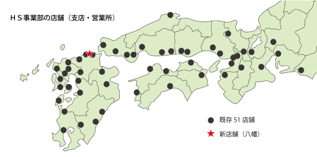 HS事業部は、九州、中国、四国、関西、中京地区に店舗を展開し、シロアリ消毒(約81万戸の施工実績)や床下換気、家屋補強や耐震改修など、戸建住宅向けサービスを提供しています。八幡営業所は52店舗目となります。