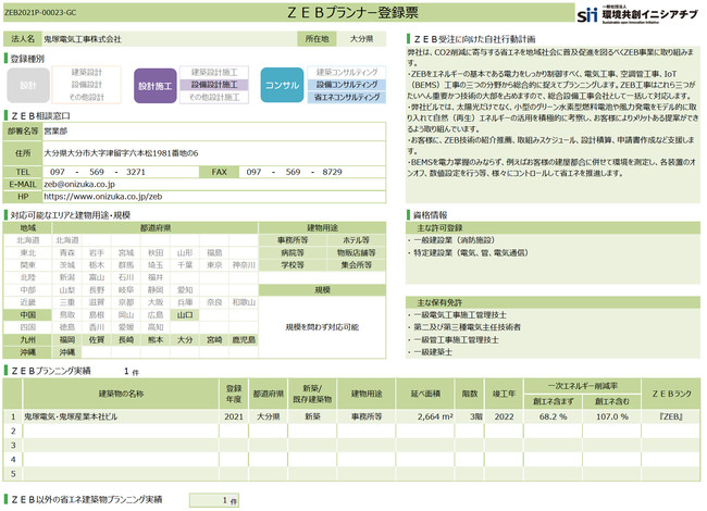 鬼塚電気工事(株)は、経済産業省並びに環境省のZEB事業を推進しているSII(環境共創イニシアティブ※1)に、かねてよりZEBプランナー登録を申請しておりましたが、令和3(2021)年10月29日に登録・公開されました。