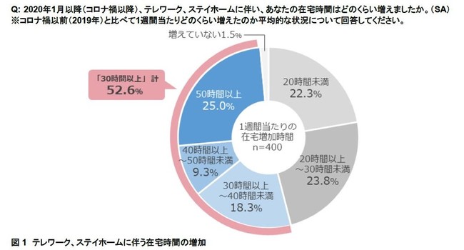コロナ禍のテレワーク、ステイホームに伴い、自宅で過ごす時間はどのくらい増えているのでしょうか。テレワークを経験した男女に、「2020年1月以降、あなたの在宅時間はどのくらい増えましたか」と聞いたところ、約5割(52.6%)の人で1週間当たり30時間以上も増加していることが分かりました(図1)。