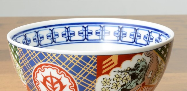 また丼の内側帯飾りはMSのハッチ風意匠を、下部帯飾りには「隠し連ザク」を取り入れて、単なる「和風どんぶりではない」デザインに仕上げました。