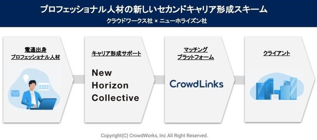 企業と個人をつなぐオンライン人材マッチングプラットフォームを開発・運営する株式会社クラウドワークス(本社:東京都渋谷区 代表取締役社長 兼 CEO:吉田 浩一郎 以下「当社」)が運営する、業界最大級の副業マッチングサービス「Crowd Links(クラウドリンクス)」では、人生100年時代の新しい働き方を提案するニューホライズンコレクティブ合同会社(東京都中央区、代表:山口裕二・野澤友宏 以下「NH社」)と協業し、NH社に集う電通を退職し独立した個人事業主・法人主と共に、事業課題を持つ企業や公的機関のマッチングによる「プロフェッショナル人材の新しいセカンドキャリア形成」に向き合う新たな取り組みを実施します。