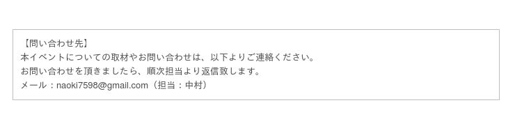 ・「御社名」「取材代表者名」「取材人数」「連絡先」をご記入の上、以下問い合わせ先までご連絡ください。