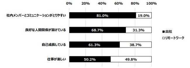 9月30日で全都道府県の緊急事態宣言が解除され、コロナに対して引き続き油断はできないものの、今後は再び出社を促す企業が増えてくることも考えられます。そこで今回は、出社メインだったときと現在のリモートワークメインの状況を比較して、社内コミュニケーションや仕事への向き合い方などについてどう感じるかをお聞きしました。「社内メンバーとコミュニケーションがとりやすい」、「良好な人間関係が築けている」はどちらも“出社”の回答割合が高い結果となりました。実際に会って話すことでコミュニケーションの質が上がると感じている方も多いでしょう。また、「自己成長している」、「仕事が楽しい」でも“出社”の回答が多い結果となり、出社している方が前向きに仕事に取り組めているのかもしれません。