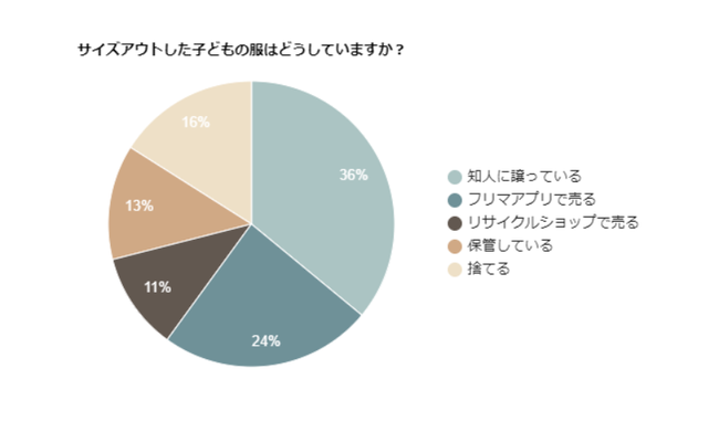 すると、36%の人が「知人に譲っている」と回答したのです。ママ友の間で、サイズアウトした子どもの服を譲り合うことはコミュニケーションの一つとして確立しているようでした。