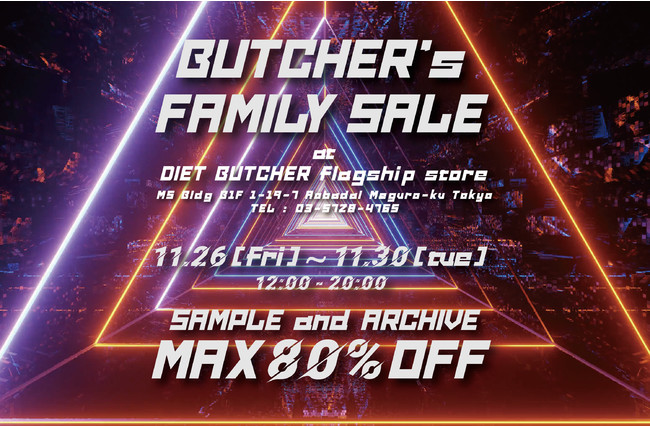 DIET BUTCHER のファミリーセールが11月26日より期間限定で開催!!過去のコレクションアイテムやサンプルを最大80%OFFでご用意しております!!