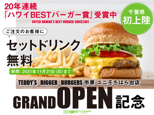 20年連続ハワイベストバーガー賞受賞の「テディーズビガーバーガー」が、2021年11月19日(金)、千葉県市原市の大型ショッピングセンター「ユニモちはら台」に、新店舗をオープンいたしました。